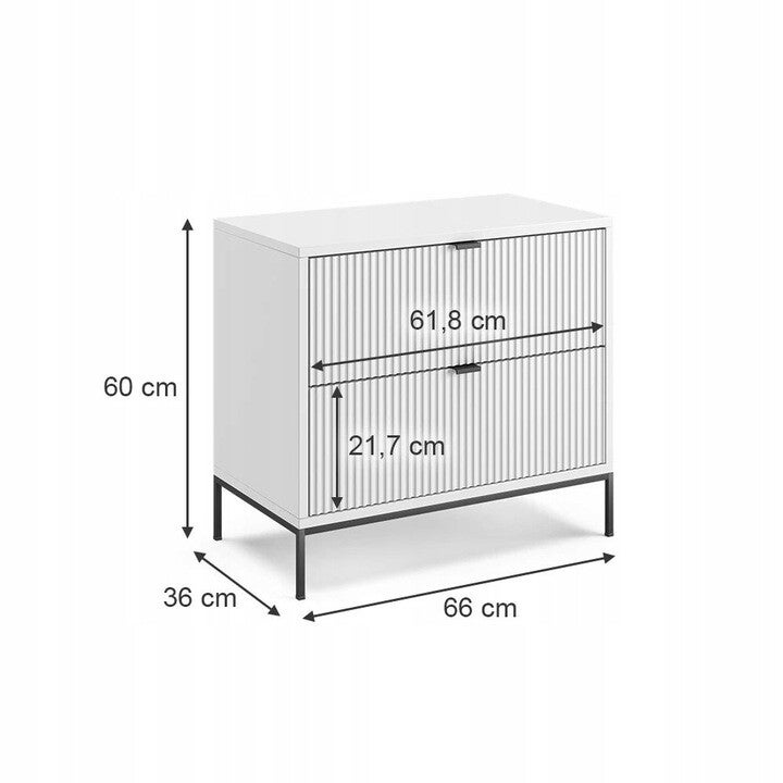Stolik nocny Vicco zachwyca nowoczesnym designem, który nada Twojemu pomieszczeniu stylowego akcentu. Dzięki dwóm pojemnym szufladom komoda oferuje wystarczająco dużo miejsca do przechowywania rzeczy osobistych. Montaż jest łatwy i nieskomplikowany, dzięki czemu możesz szybko cieszyć się swoim nowym meblem. Materiał jest łatwy w czyszczeniu i charakteryzuje się dużą wytrzymałością, dzięki czemu jest trwały i łatwy w pielęgnacji. Nasza szafka nocna jest częścią serii mebli Eliza.
