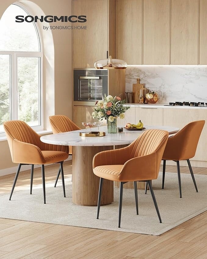 DOTYK ELEGANCJI Dzięki karmelowo-brązowej pikowanej aksamitnej powierzchni i czarnym metalowym nogom, to tapicerowane krzesło wniesie elegancję i nowoczesność do Twojego wnętrza.