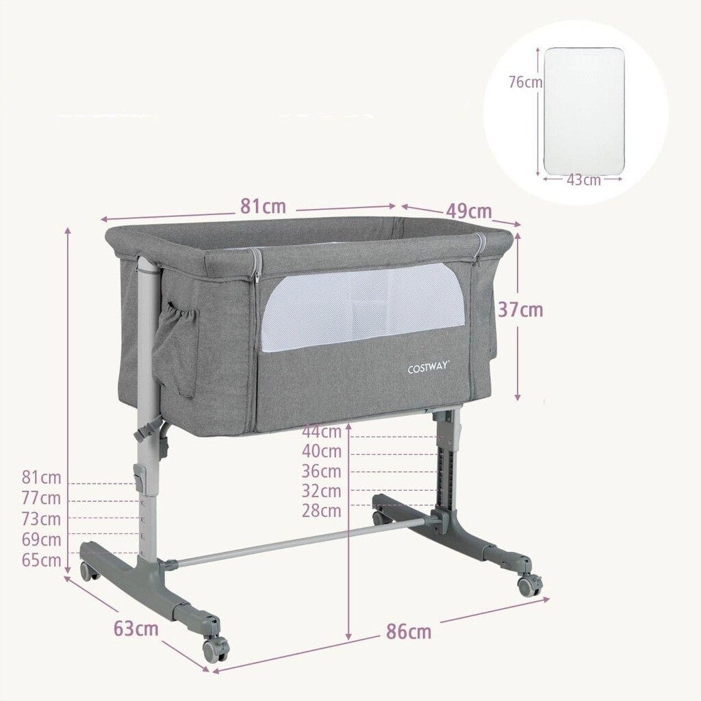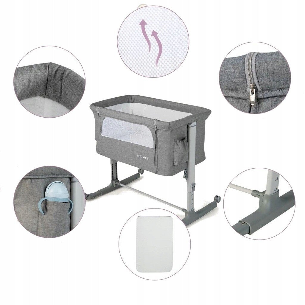 Regulowana wysokość i kąt nachylenia: Aby dopasować się do łóżek o różnej wysokości, to przenośne łóżeczko ma regulowaną wysokość w 5 pozycjach. Każdą stronę barierki można regulować w pionie i niezależnie, co ułatwia kładzenie dziecka do łóżeczka, kołysanie go lub usadzanie.