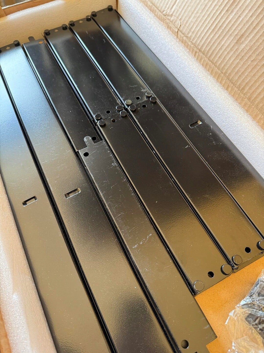 Jeden regał niekompletny. Możliwe złożenie jednego regału z pięcioma półkami oraz połówki regału z czterema półkami. Brak 4 słupków narożnych, jednej półki (kompletu tj elementów metalowych oraz płyty), łączników słupków narożnych. Kilka elementów z małymi rysami widoczne raczej z bliska.