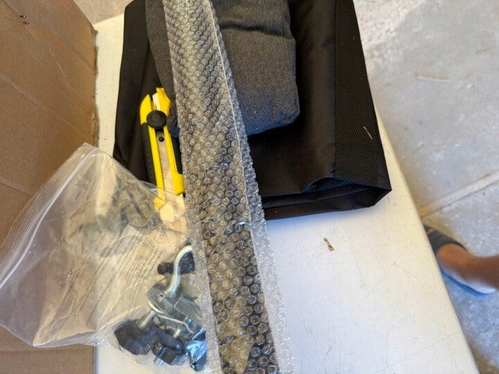 Rysy w kilku miejscach do ewentualnego pomalowania. Nie wpływa na funkcjonalność. Materiał hamaku z małą dziurką do zaszycie we własnym zakresie.