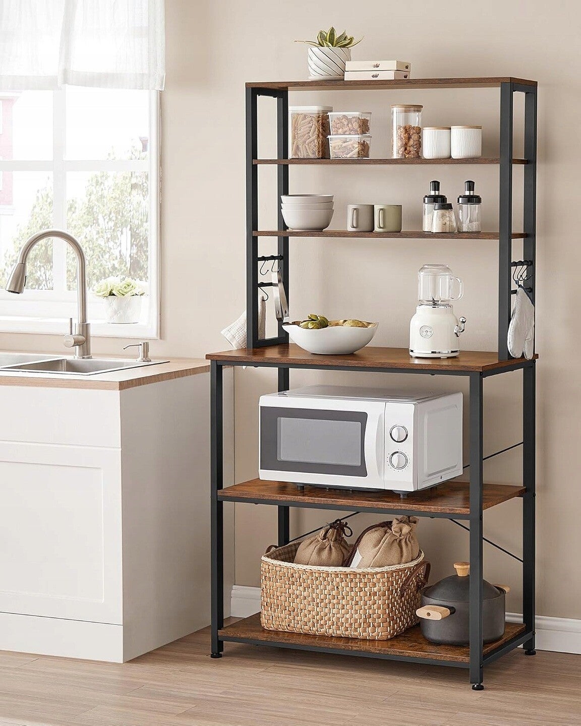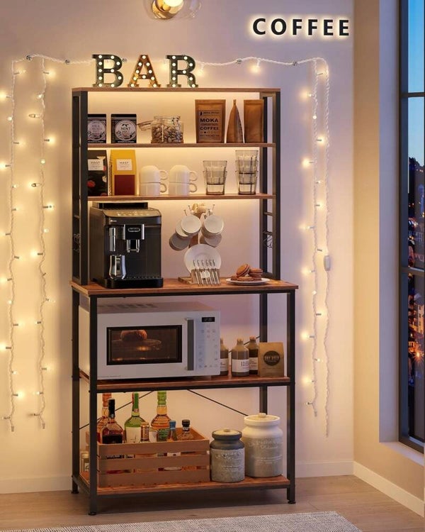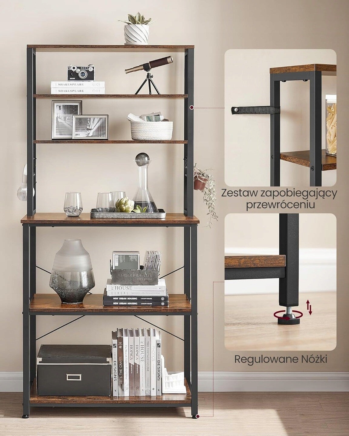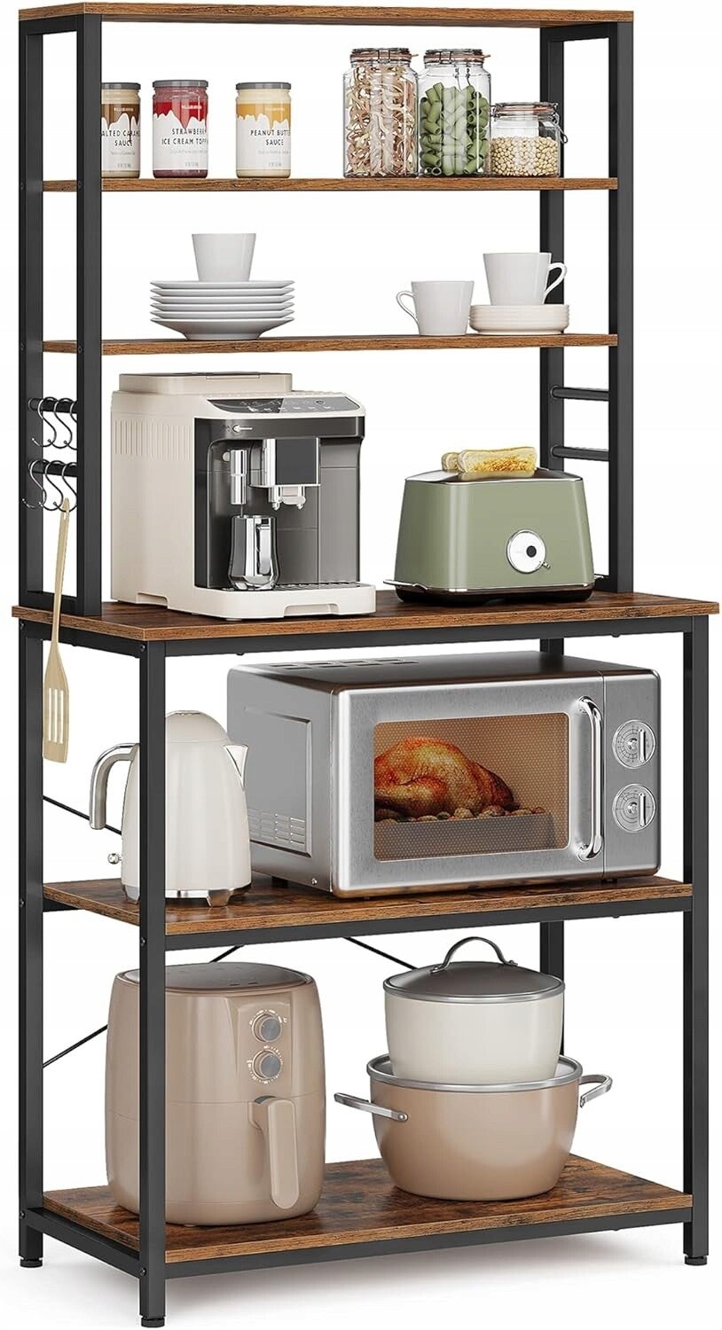 Regał kuchenny w rustykalnym stylu tworzy element dekoracyjny i praktyczność do każdej kuchni, która gwarantuje stabilność i wytrzymałość dzięki stalowej ramie. Regał składa się z trzech dolnych dużych półek, które pozwalają na bezpieczne przechowywanie większych przedmiotów dzięki skrzyżowanym prętom z tyłu. Trzy węższe półki znajdujące się u góry doskonale sprawdzą się do umieszczenia mniejszych akcesoriów takich jak przyprawy, kubki czy książki kucharskie. Dodatkowo, sześć haczyków w kształcie litery S umieszczonych na bokach regału zapewniają dodatkową przestrzeń do wieszania różnych narzędzi i akcesoriów kuchennych. Rustykalny brąz płyty wiórowej połączonej z czarną stalową konstrukcją doda do wnętrza loftowy urok, a dodatkowo nieocenioną funkcjonalność.