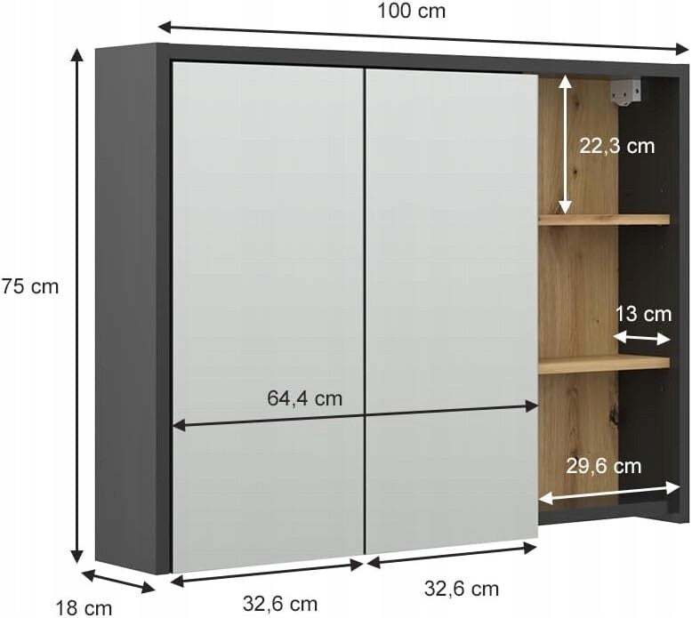 - Wymiary: szafka łazienkowa z lustrem ma następujące wymiary: szerokość: 100 cm, wysokość: 75 cm, głębokość: 18 cm. Wszystkie szczegółowe rozmiary są podane na zdjęciach.