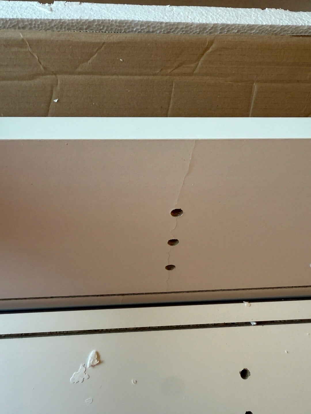 Pęknięty lakier na jednym elemencie, po zamontowaniu nie widać a szafka nie traci na funkcjonalność i zachowuje sztywność. Niewielkie wgniecenie na drugim elemencie.