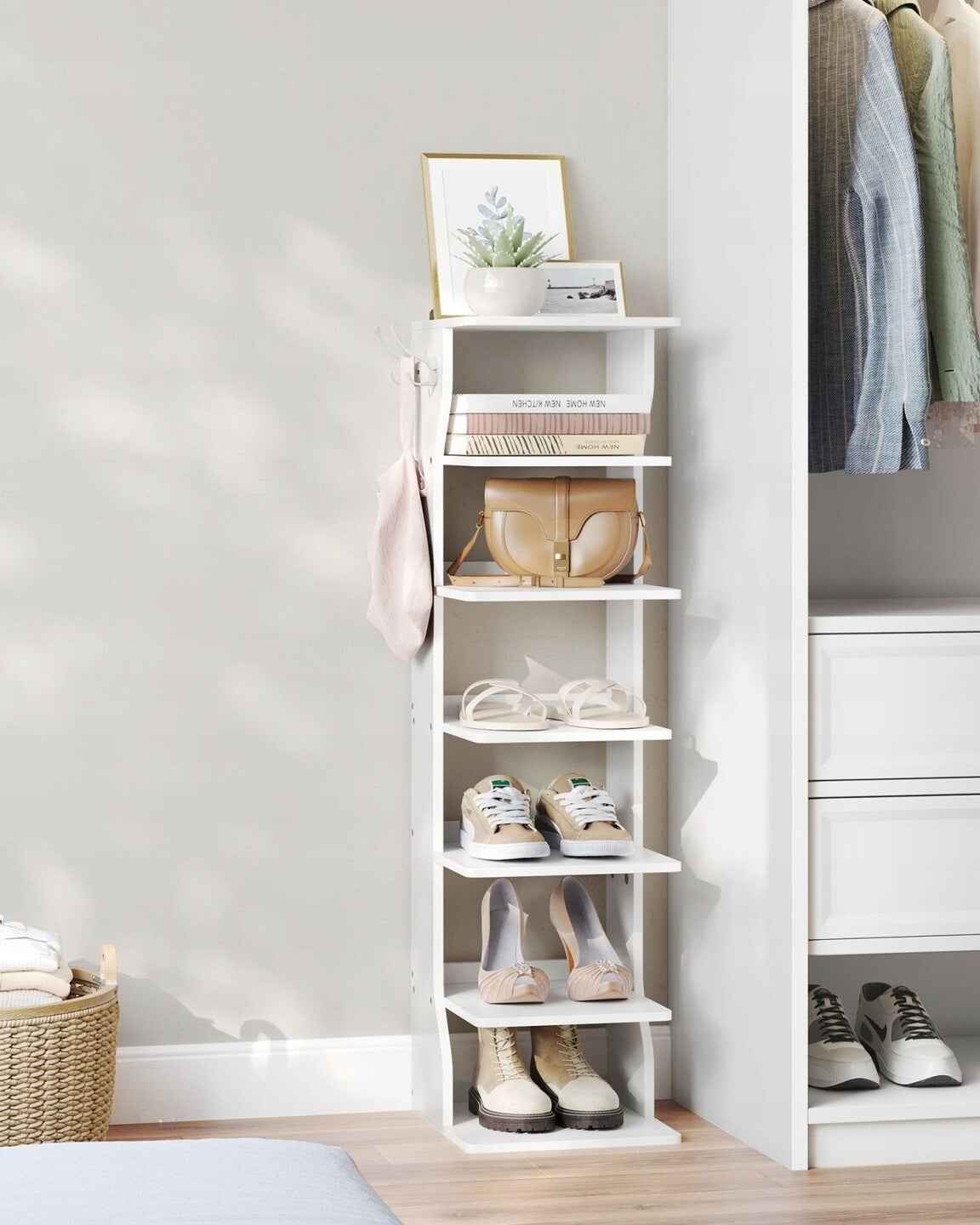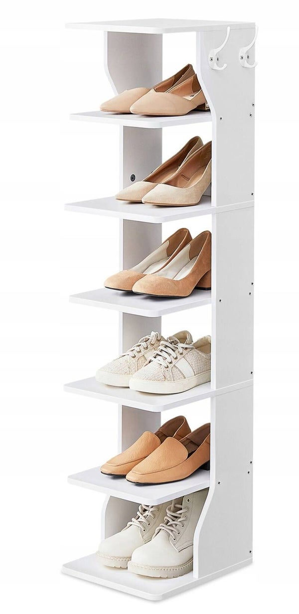 Praktyczna wąska biała półka na buty z 6 poziomami, która zaoszczędzi miejsca przy wejściu lub narożniku z dodatkowymi dwoma bocznymi haczykami na klucze