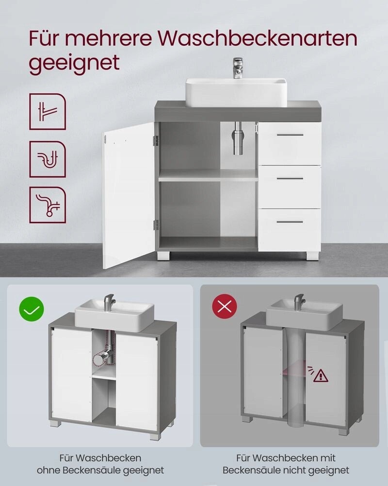 - Dużo miejsca do przechowywania: ta szafka pod zlewozmywak z 3 dużymi szufladami bocznymi i 2 przegródkami za drzwiami szafki zapewnia mnóstwo miejsca do przechowywania przyborów kąpielowych, ręczników itp.